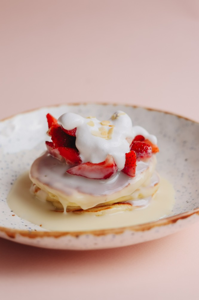 Панкейки з кокосовим соусом та полуницею