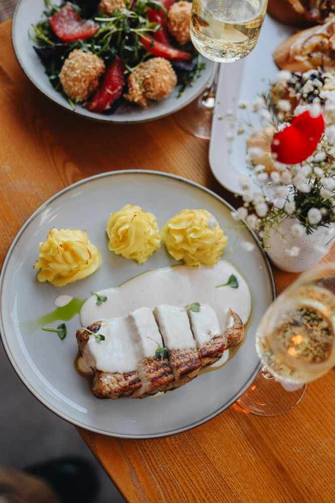 Філе індички під сирним соусом з запеченим картопляним пюре