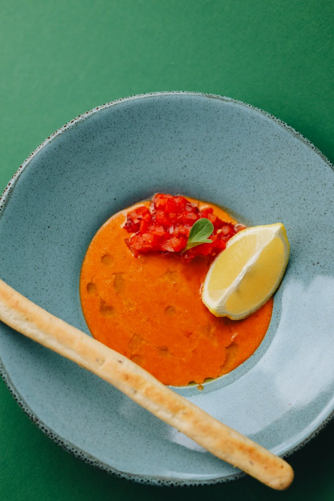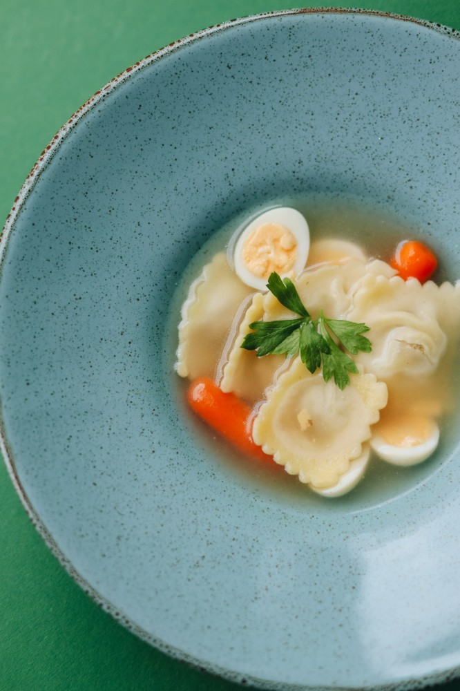 Бульйон з равіолі, перепелиним яйцем, та бейбі-морквою