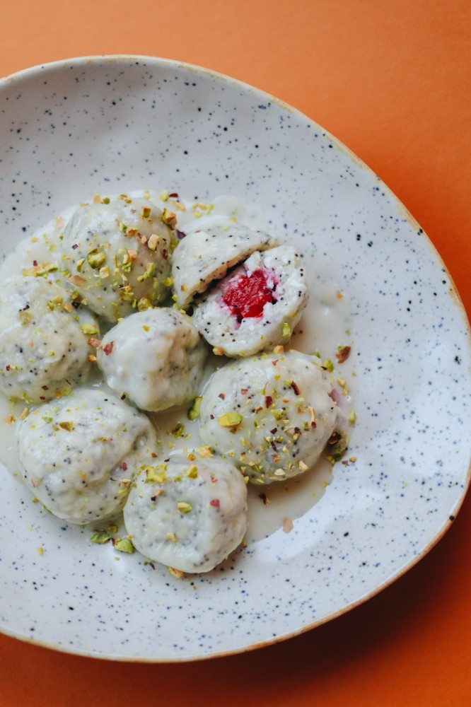Ліниві вареники з вишнею і кокосовим соусом