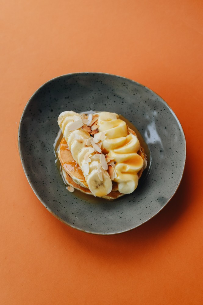 Бананові панкейки з заварним кремом та кленовим соусом